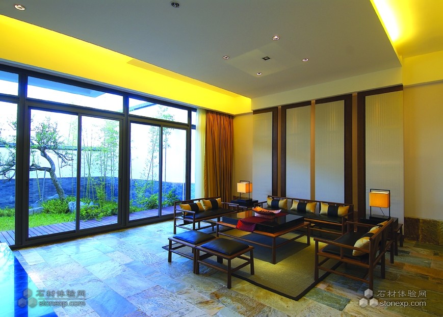 仿古面石材地面,石材表面經(jīng)過了特殊處理。顏色較深,搭配中式家具,讓整個客廳空間古樸莊重。