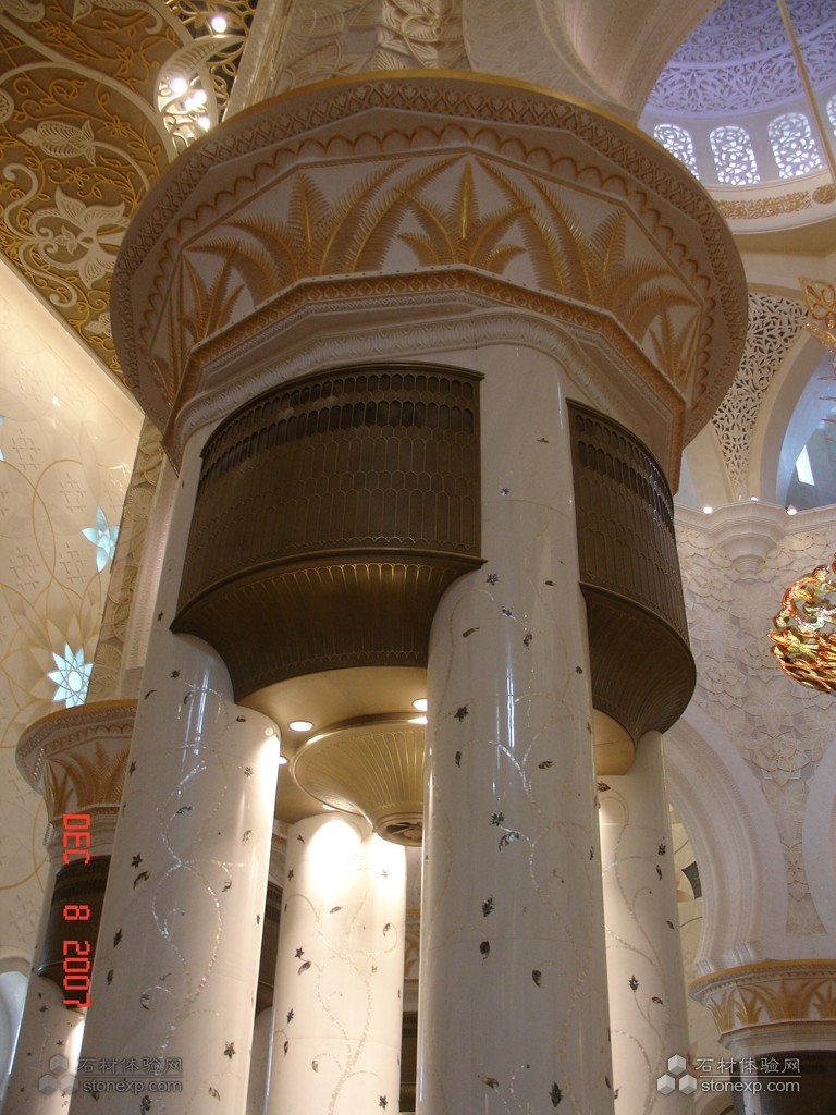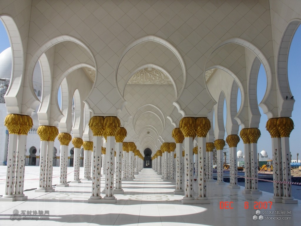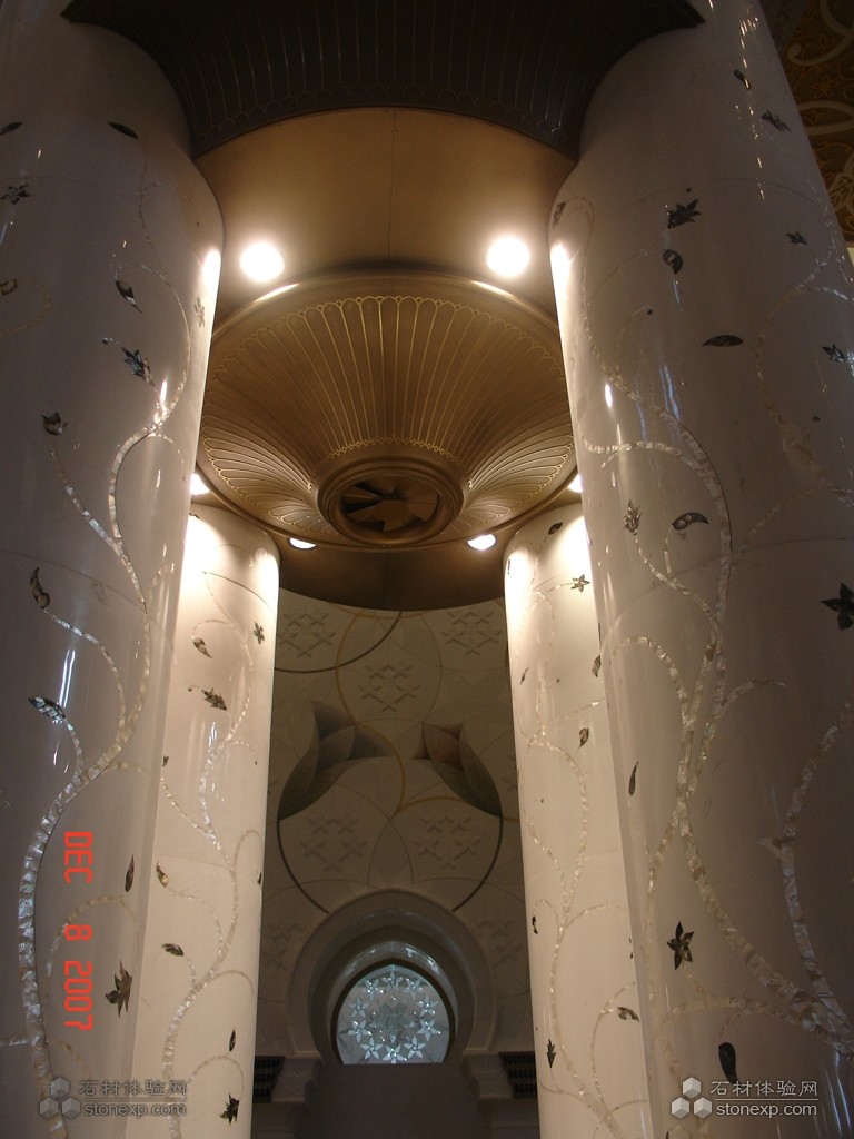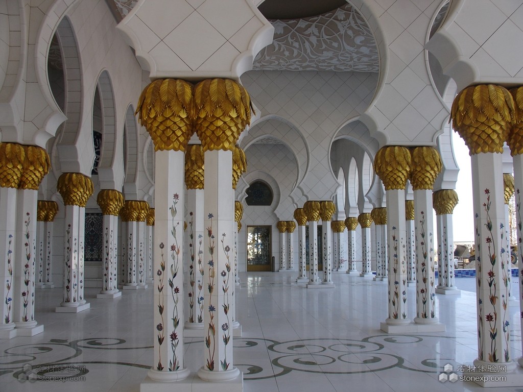 世界上最大的清真大廟。為紀(jì)念阿聯(lián)酋開(kāi)國(guó)總統(tǒng)扎耶德而興建,并以其名字命名。香港環(huán)球石材集團(tuán)將貝殼鑲嵌入石材工藝圓柱,將傳統(tǒng)的水刀拼花從直線型實(shí)現(xiàn)到垂直流線型的變化,其工藝為國(guó)內(nèi)外首創(chuàng),這一技術(shù)已申請(qǐng)了國(guó)家發(fā)明專利。