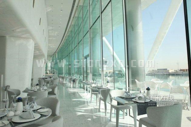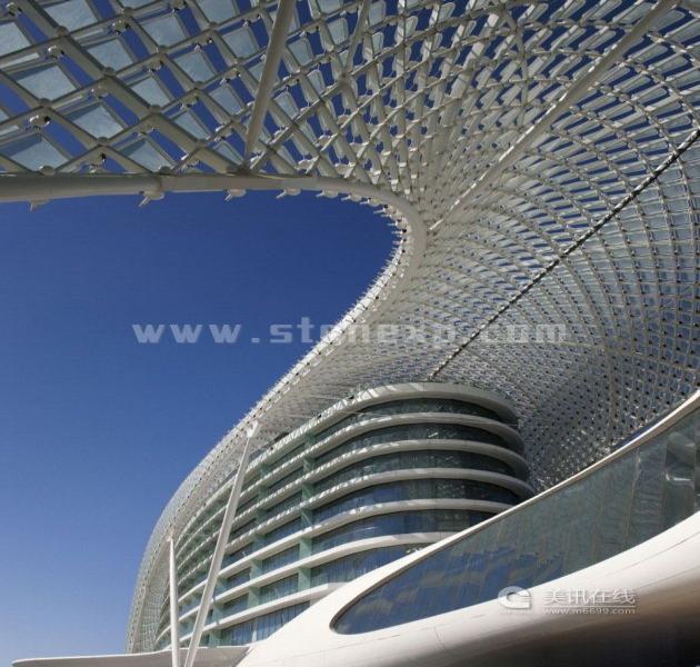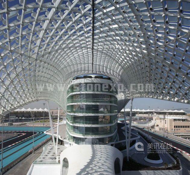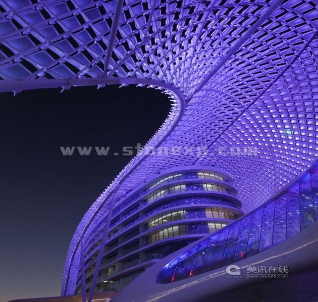 Yas酒店的外表由一個(gè)217米長(zhǎng)的大型曲線網(wǎng)構(gòu)成,主要材料是鋼筋和5800個(gè)鉆石型玻璃板。網(wǎng)格式外殼讓建筑看起來像是大氣層,“大氣層”下面是酒店的兩個(gè)主樓,兩個(gè)主樓之間以橋相連,這個(gè)橋給人的感覺就好像——賽車正從F1賽道經(jīng)過,然后打算穿過大樓。網(wǎng)格式外殼把兩個(gè)主樓合為一體,而由它產(chǎn)生的光學(xué)效果和光譜反射所組成景象可以媲美周圍的天空、大海和沙漠風(fēng)景。