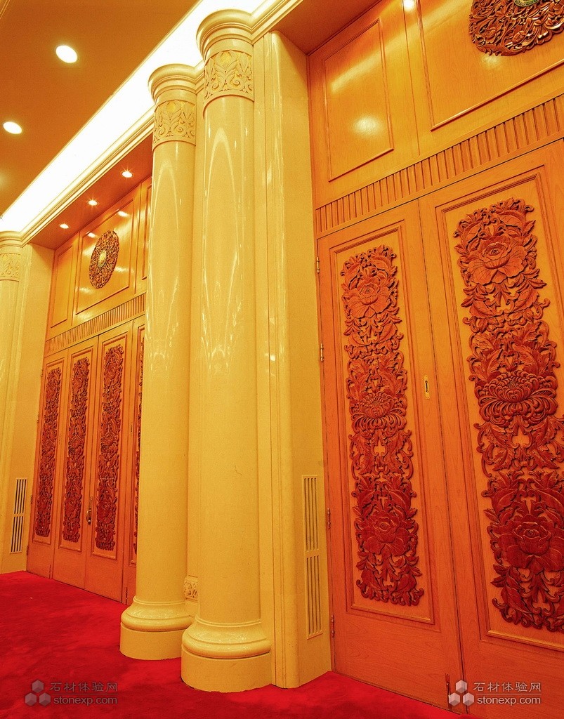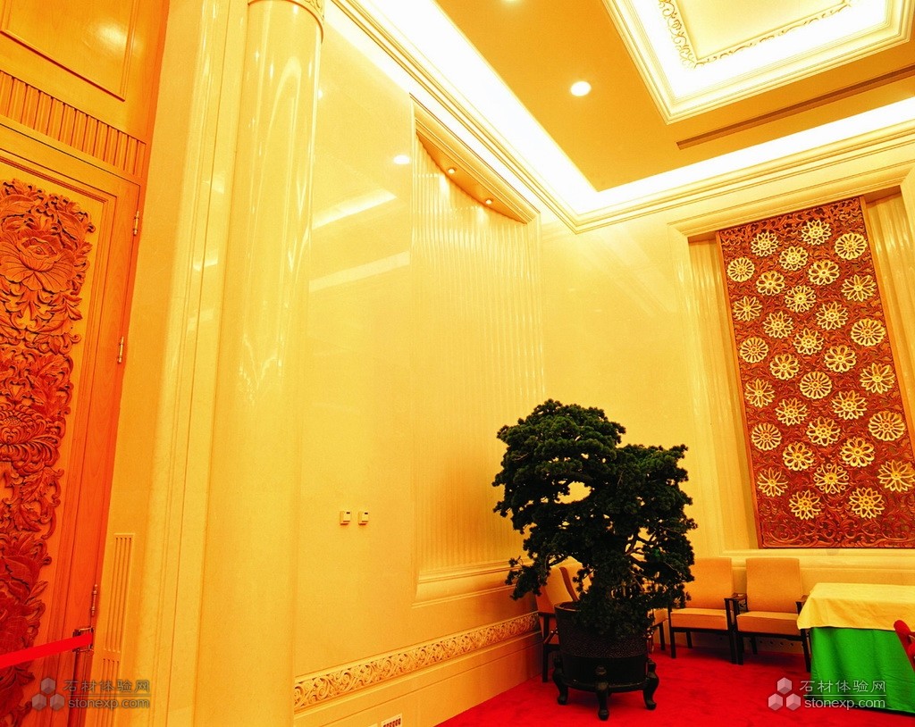北京人民大會(huì)堂北京廳 地點(diǎn):北京 年份: 品種:莎安娜米黃、伯利黃 亮點(diǎn):半圓柱、腰線雕花 概述: 要表現(xiàn)的主題:莎安娜米黃墻面的高貴、典雅 要表現(xiàn)的石材質(zhì)感(要素):米黃色的柔和、溫暖、大方 可以體現(xiàn)工藝難度的地方:半圓柱、腰線雕花 石材總體色調(diào):米黃色