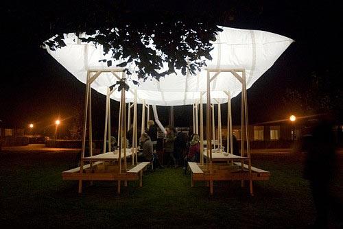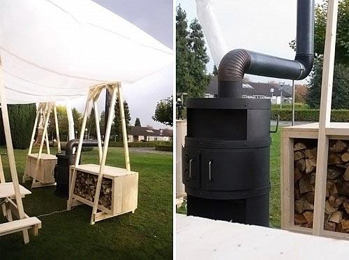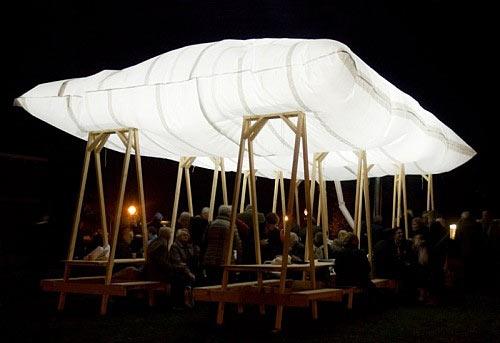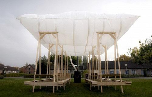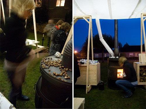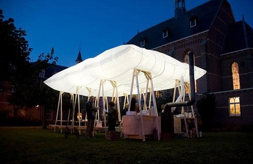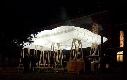 由荷蘭設計工作室的 Reinder Bakker 和 Hester Van Dijk 共同設計的充氣屋頂,實際上就是地上的烤爐出煙口連著一個充氣墊,當火爐開始運作以后,熱氣會進入到氣墊中,形成一個巨大的屋頂,氣墊下有木架支撐并固定?;馉t可以烤地瓜、栗子等等,一伙人在外露營的話,充氣屋頂是一個非常不錯的選擇哦。