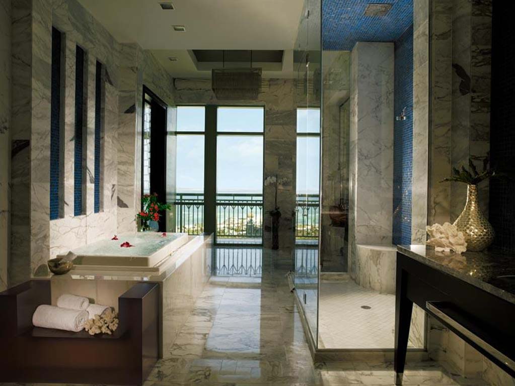 簡(jiǎn)單描述:天然大理石材的自然紋路里,透著海浪般的澎湃,與白色浴缸的絕妙搭配,堪稱海景別墅里的海景世界