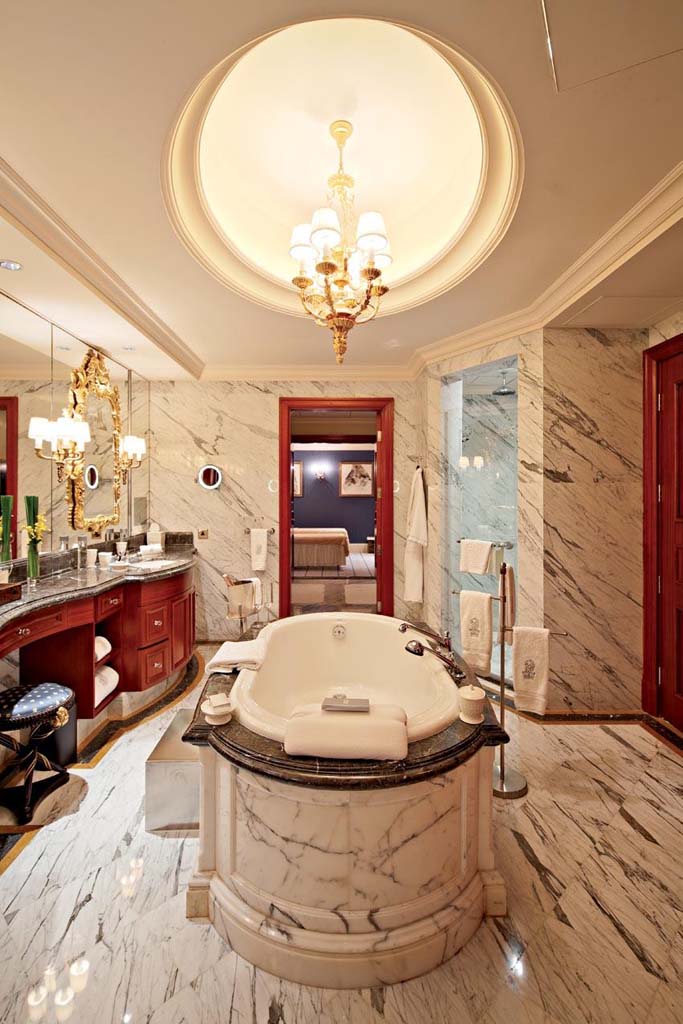 簡(jiǎn)單描述:設(shè)計(jì)師采用夸張的白色亂紋大理石,運(yùn)用到整個(gè)浴室的裝飾中,似是柳葉飄飄,頗有意境