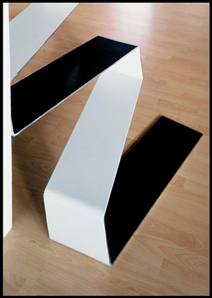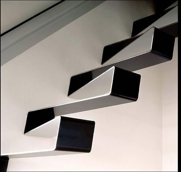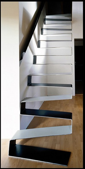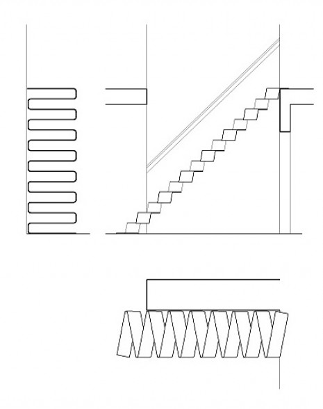一個(gè)巧妙的波紋帶被用作房子里的樓梯。樓梯使用10毫米厚的薄板來建造。毗鄰成對的踏步與外部的斜方桁架組成一個(gè)支架固定在墻上。較高的踏步承受主要的負(fù)荷,低處的踏步則承受較低的負(fù)荷。