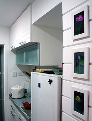打掉隔墻(非承重墻),以具有儲藏功能的收納柜來分隔空間。