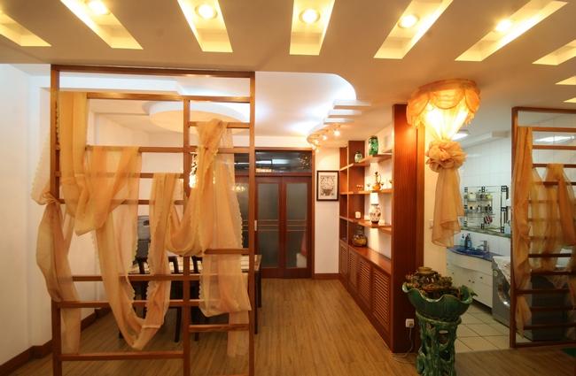 因既定的“敦煌”主題需要借用中式風(fēng)格的一些元素,所以一些簡中式的隔斷等,成了這個(gè)設(shè)計(jì)的基調(diào)。為打破中式慣有的沉悶和壓抑,再通過一些諸如水晶吊燈、玻璃工藝品的點(diǎn)綴,賦予空間以活潑靈透的色彩。
