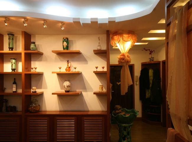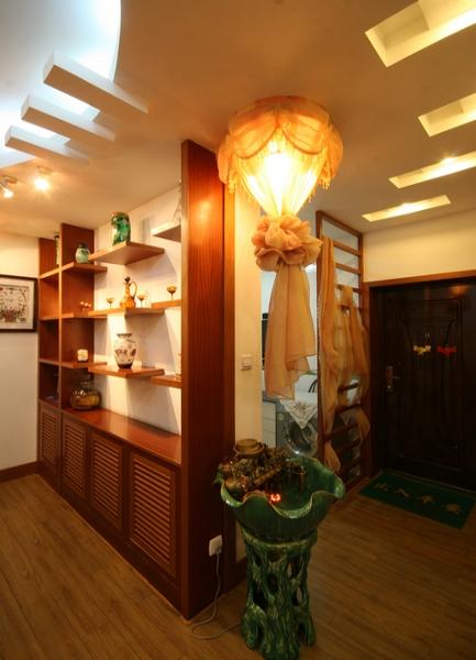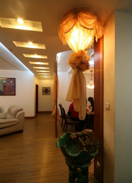 影視墻大理石的“觀音”,本已給空間帶來了幾許仙氣,而玄關(guān)正面煙霧繚繞的蓮花造型加濕器,更是給空間帶來了人間天堂的意味,再加上加濕器上方用絲綢作的“花燈”,飄然的外觀和朦朧的燈光,更是給空間帶來“仙境”的象征。