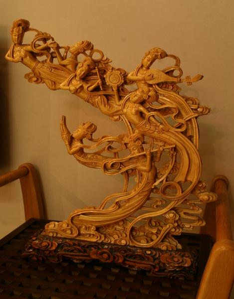 現(xiàn)放置在臥室的飛天木雕,曾是最早確定的文化主題設(shè)計(jì)符號(hào)之一。