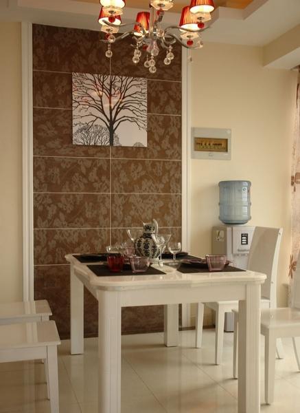 花朵等圖案的閃光窗簾,為整個(gè)設(shè)計(jì)增添了亮色。而餐廳窗簾華麗的花朵圖案更是與餐廳背景墻上的咖啡色刻花瓷磚交相輝映,塑造了一方都市里的田園風(fēng)光。
