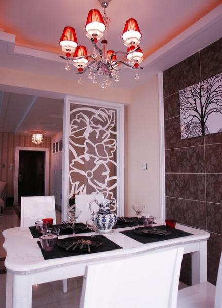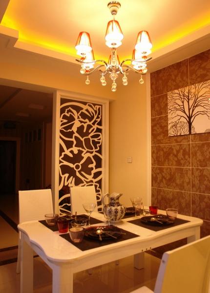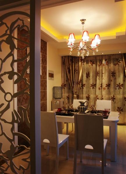 客廳與餐廳的隔斷為一花朵圖案鏤空的木作,同時(shí),她又是進(jìn)門后的視線屏障,撫慰著浮躁的心。透過該隔斷,無論是望向餐廳還是客廳,濃郁的小資浪漫風(fēng)情撲面而來。