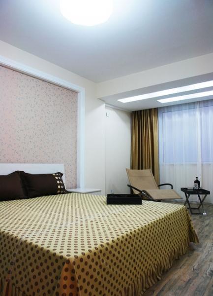 臥室,與客廳相比,多了幾分莊重與沉穩(wěn)。黃與咖色的搭配,再輔以仿古地板,自然的氣息撲面而來。