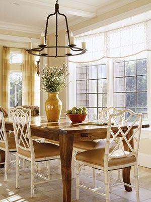 如果你的餐廳鄰近其它的起居空間。那么建議兩個(gè)空間用同一種顏色做基調(diào),再選擇一些不同的,但與主色調(diào)相近的小裝飾品點(diǎn)綴。本圖餐廳,主人就選用了淡黃色的紗簾,金黃色的椅套,使餐廳整體效果看起來和諧,明快。[page]