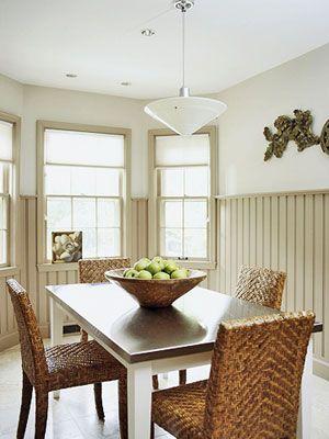 很多家庭都會在廚房留出空間作為餐廳,那么建議將之布置得越簡單越好。圖中的餐廳就在廚房一角,主人選擇了簡單的木拉簾,選用了樣式中規(guī)中矩的餐桌椅。雖然布置簡單,但干凈利落,使人神清氣爽。餐桌椅角底都是毛氈做成。避免了推來推去給地板造成的損害。[page]