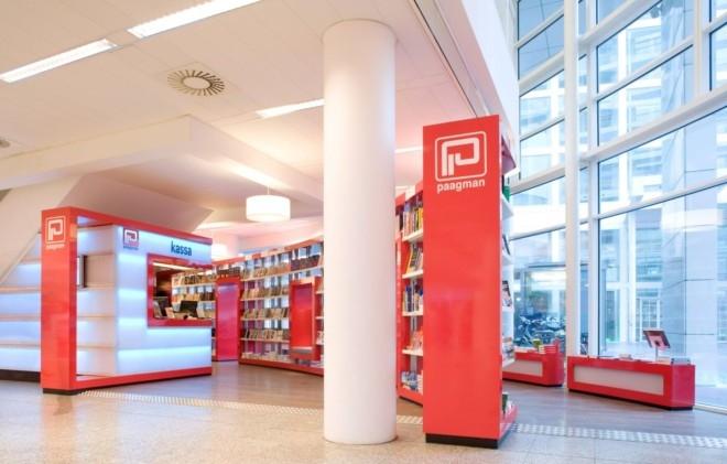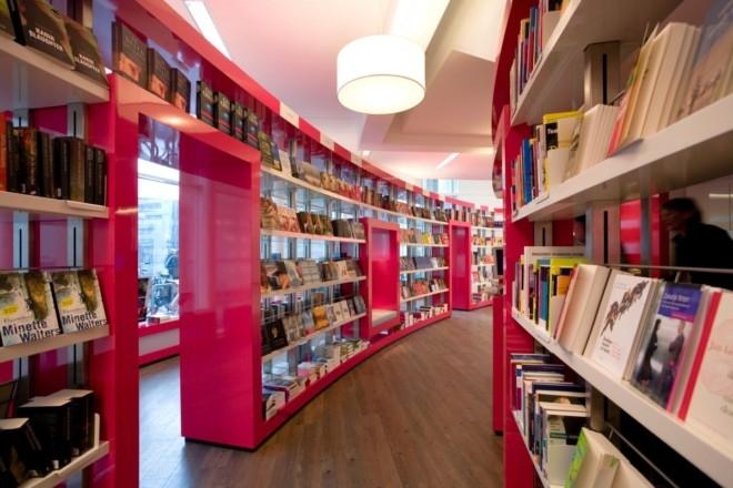 整個書店的設(shè)計以紅色調(diào)為主,藍色的燈光襯托下,處處透著朝氣,像是遨游在書的海洋中。