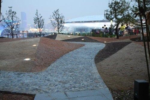 “新九洲清晏”高出地面14米,面積約2.7萬(wàn)平方米,在世博會(huì)會(huì)期里主要用于人流集散,在世博會(huì)后為公共休閑場(chǎng)所。 “新九洲清晏”以屋頂平臺(tái)開(kāi)闊的中心廣場(chǎng)寓意內(nèi)湖水面,以九處園林景觀寓意九個(gè)島嶼。作為中國(guó)館主體的國(guó)家館位居“新九洲”之首,以“雍”命名,取“和諧”、“本”、“宗”之意;其他八洲依地勢(shì)和氣候分別為“田”、“澤”、“漁”、“脊”、“林”、“甸”、“壑”、“漠”,這些都是中華大地上的典型地貌景觀。象征荒漠、戈壁部分小島上還會(huì)建幾間小房子,作茶室、咖啡屋等休閑用途,有意思的是,這些小房子也會(huì)與每個(gè)小島的環(huán)境匹配,比如在“漠島”上,茶室就會(huì)被“埋”在一座沙丘底下。圓明園的“九洲清晏”被水系分割,當(dāng)年是用大量的橋連接而成,因此在世博園的屋頂花園中,也是以水面來(lái)環(huán)繞每個(gè)小島,并在水面上三四厘米處,設(shè)立步道,讓參觀者穿梭水澤之間,體會(huì)清涼的感覺(jué)。以碧水環(huán)繞的九個(gè)島嶼將通過(guò)不同景觀的展現(xiàn)反映不同的自然地貌和人的生存狀態(tài),象征我國(guó)廣袤遼闊的疆土。[page]