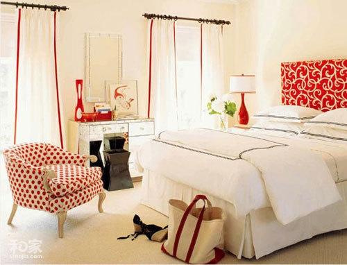 2、地面滿鋪暖白色地毯,墻面淺磚紅色,頂棚米色,床罩暖白色,家具主要是赭石色,再加紅、綠色植物,整個房間同樣充滿了喜慶,具有溫暖感。