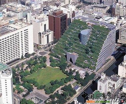 日本福岡市的ACROS綠屋頂,因其獨(dú)特的設(shè)計(jì)和對(duì)綠色空間最大限度的保留而引人注目。該建筑一側(cè)面朝福岡市最繁華的商業(yè)街,這一側(cè)為玻璃墻,使其看起來(lái)和傳統(tǒng)的辦公大樓無(wú)異,而另一側(cè)卻是一個(gè)巨大的綠色房頂。綠屋頂如梯田般一層一層向下依次排開(kāi),共覆蓋著35,000棵植物。整個(gè)綠屋頂延伸至地面的花園。
