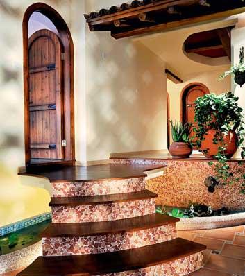 在這樣一間充滿(mǎn)熱帶風(fēng)情的居室中,綠色植物當(dāng)然是必不可少的,植物不僅可以?xún)艋諝?,改善室?nèi)環(huán)境,合理的搭配還能起到賞心悅目的效果。設(shè)計(jì)師在客廳的一角挖了一個(gè)不規(guī)則的小水池,穿過(guò)中空的樓梯,繞著臺(tái)階蜿蜒而行,形成了一個(gè)交錯(cuò)的小空間,使房間的這個(gè)角落立體感十足。