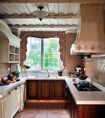 穿過(guò)餐廳,進(jìn)入廚房,這一長(zhǎng)列的吊頂全都用木頭做成,讓度假屋的感覺(jué)一直延續(xù)到廚房。廚房的窗戶(hù)被安上了一個(gè)碎花圖案的窗框,多了幾分鄉(xiāng)村氣息;金屬質(zhì)感的排氣扇也用木頭整個(gè)包裹起來(lái),看上去更像一個(gè)煙囪,與周?chē)沫h(huán)境統(tǒng)一和諧;油畫(huà)夾在兩個(gè)吊柜之間鑲在墻上,畫(huà)里畫(huà)外形成一種奇特的立體效果,仿佛一伸手,就能從畫(huà)里端出可口的美食。