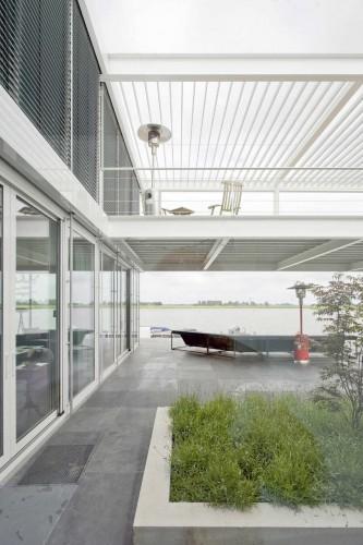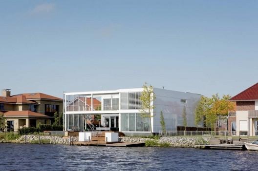 這是一個(gè)位于荷蘭郊區(qū)的住宅,總體平整,周圍是綠色的新辟土地,堤壩和許多的湖。住宅沖著湖面排布,具有開闊敞亮的空間,它不是一系列獨(dú)立房間的集合體,不同的房間都有沖著平臺(tái)的景色,設(shè)計(jì)的安排使每一個(gè)單獨(dú)的房間都成為一個(gè)大環(huán)境的一部分。