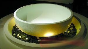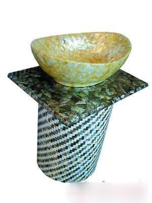 貝殼馬賽克制作的藝術(shù)臺盆。如玉石般紋理和光澤的新型彩玻臺盆。