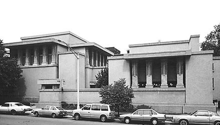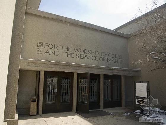 年建造的聯(lián)合教堂顯示出賴特的創(chuàng)新精神。這里沒有用常見的象征性的尖塔和陡坡頂。他認(rèn)為這樣的象征太像文字。他認(rèn)為教堂應(yīng)作為公眾集會和游樂的場所。因此,他設(shè)計(jì)了這座平屋頂建筑。由于投資少,現(xiàn)澆混凝土內(nèi)外墻面均未修飾。教堂形狀為正立方體,四周邊長、高度都相等,以節(jié)省模板。賴特著意處理好內(nèi)部空間,力圖打破匣子般的感覺。