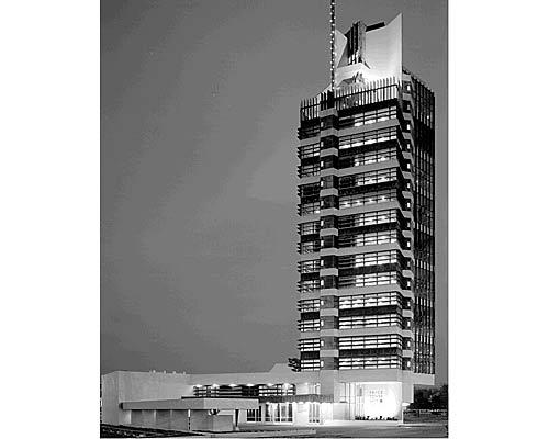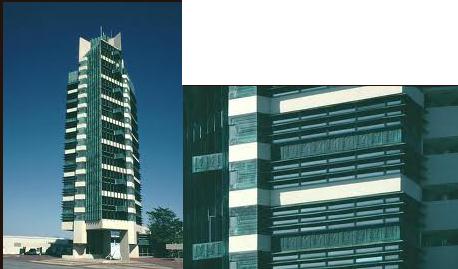 1952年,賴特設(shè)計建成的普賴斯大樓,他自稱體現(xiàn)了廣畝城市的又一個特征。大樓所在地巴特爾斯維爾是個小城鎮(zhèn),到1960年還只有27000人。建筑物的平面布局反映了手工作坊時代作場和住處的混合。塔樓17層,外觀別致,垂直線條和水平線條相間,體形凹凸交錯,完全不同于城市中那些方匣子般的高層建筑。