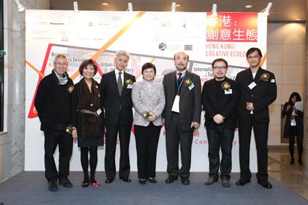 7位出席嘉賓攜手掀開香港的創(chuàng)意景觀 (由左至右):著名設(shè)計(jì)師靳埭強(qiáng)、“香港:創(chuàng)意生態(tài)”活動(dòng)的總策展人羅啟妍、康樂及文化事務(wù)署助理署長(文物及博物館)吳志華博士、香港特別行政區(qū)商務(wù)及經(jīng)濟(jì)發(fā)展局局長劉吳惠蘭、香港設(shè)計(jì)中心主席羅仲榮、香港設(shè)計(jì)中心董事局副主席劉小康及年輕設(shè)計(jì)師張漢文。