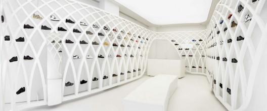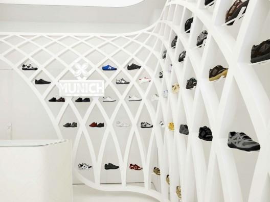場(chǎng)館空間被金屬結(jié)構(gòu)定義,它們相當(dāng)于是場(chǎng)館的第二層皮膚,它們環(huán)繞已有空間,兩者之間沒(méi)有任何接觸,同時(shí)可以展示鞋子。作為體育時(shí)尚品牌的MUNICH近日在西班牙的巴倫西亞開(kāi)設(shè)一店,專(zhuān)營(yíng)店由Dear design公司設(shè)計(jì),它在展示鞋子的同時(shí)將游客沉浸在一個(gè)體育場(chǎng)館一樣的環(huán)境中,內(nèi)部充滿(mǎn)光線,并有很多懸掛的金屬結(jié)構(gòu)。