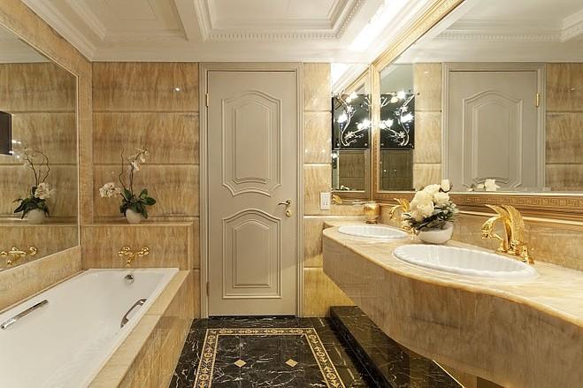 這棟豪宅設(shè)計(jì)的室內(nèi)設(shè)計(jì)之主衛(wèi)內(nèi)部完全由大理石鋪就──地板上鋪著黑色大理石,水槽、墻壁和浴盆槽鋪著溫暖的黃色大理石。[page]