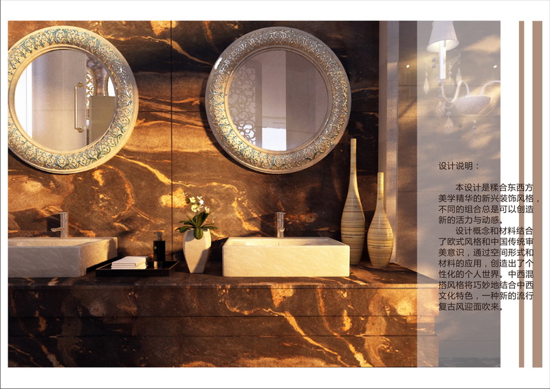 本設(shè)計(jì)是糅合東西方美學(xué)精華的新興裝飾風(fēng)格,不同的組合總是可以創(chuàng)造新的活力與動(dòng)感。 設(shè)計(jì)概念和材料結(jié)合了歐式風(fēng)格和中國(guó)傳統(tǒng)審美意識(shí),通過(guò)空間形式和材料的應(yīng)用,創(chuàng)造出了個(gè)性化的個(gè)人世界。中西混搭風(fēng)格將巧妙地結(jié)合中西文化特色,一種新的流行復(fù)古風(fēng)迎面吹來(lái)。