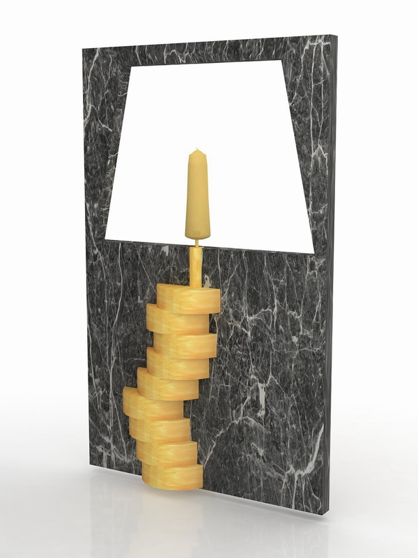 本案的設(shè)計(jì)靈感來源于我們?nèi)粘I钪薪?jīng)常用到的燈具,而此燈具的不同點(diǎn)就是將其燈罩的形式平面化,用圣羅蘭的規(guī)格板運(yùn)用水刀技術(shù)雕刻出燈具的平面式樣,在將松香黃切割成圓形,通過不同形式的組合形成現(xiàn)在的燈具造型,當(dāng)然在放蠟燭的位置也可以用燈泡來代替。