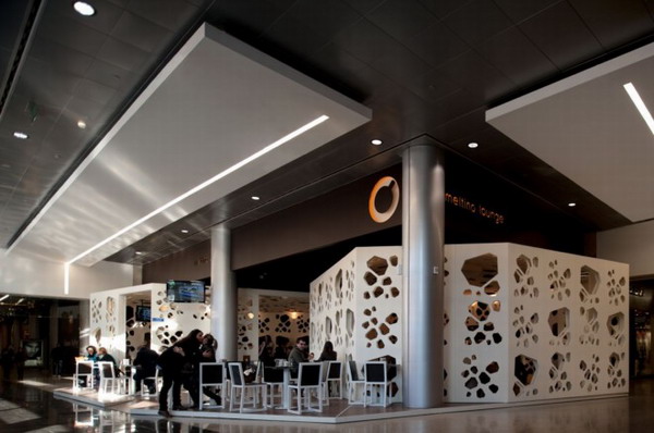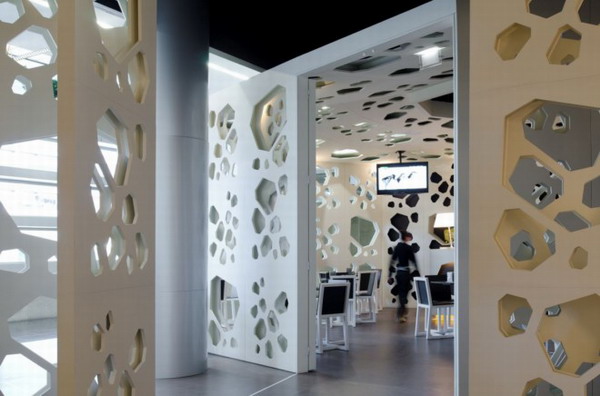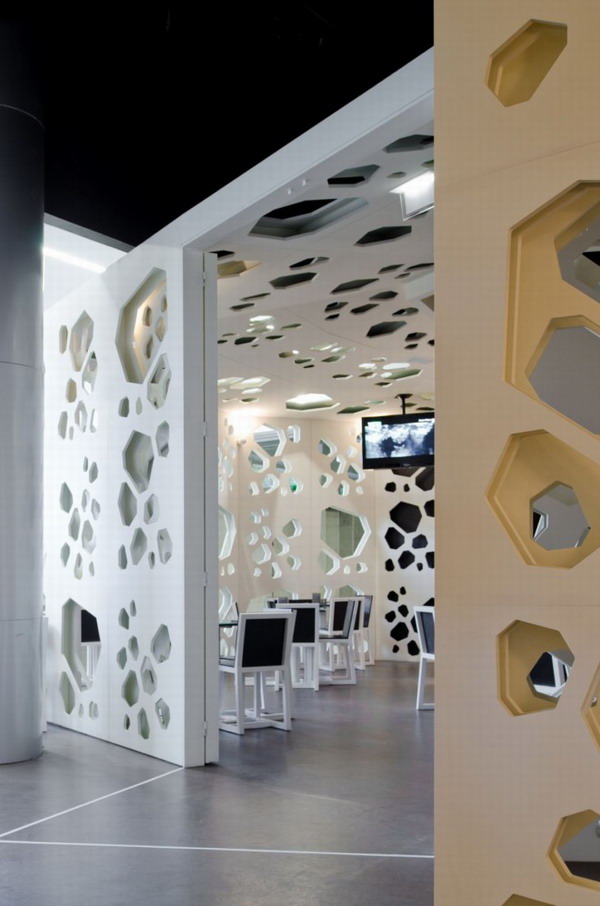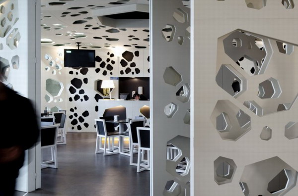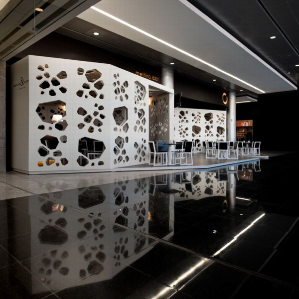 葡萄牙設計工作室LOFF完成了Meltino咖啡館的設計。整體幾何形的構造,顯得有序而幽靜,全白色色系干凈而間接,咖啡館的設計理念就是將咖啡豆幾何化,孔狀結構滲透墻面,形成不同的空間,它的影子印在地上,舞動著。