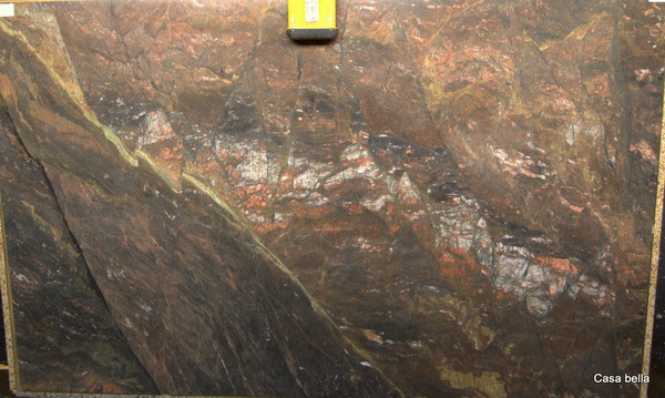Patterned more like marble than granite; veining of green, wine red and white bolts are in a sea of chocolate brown.