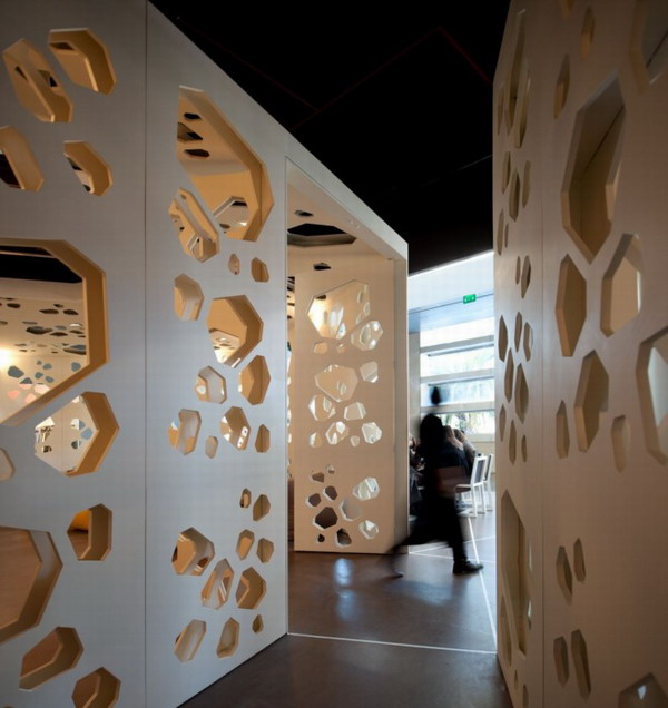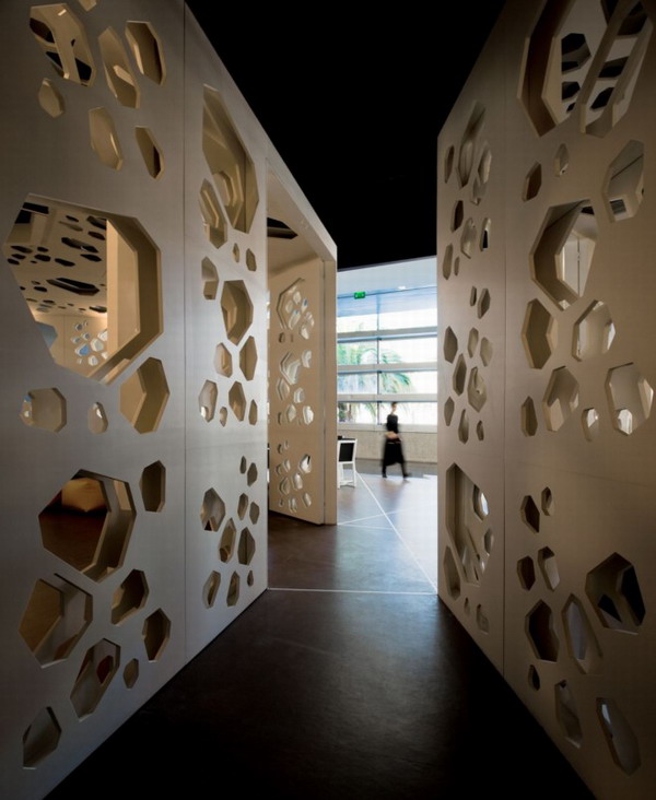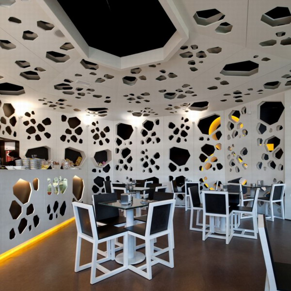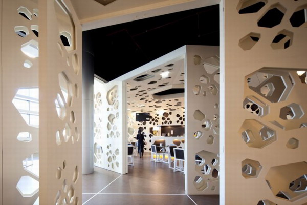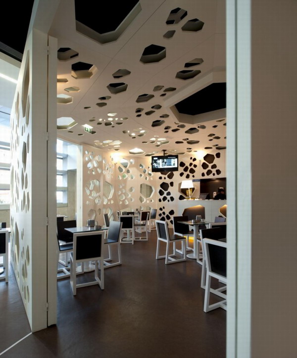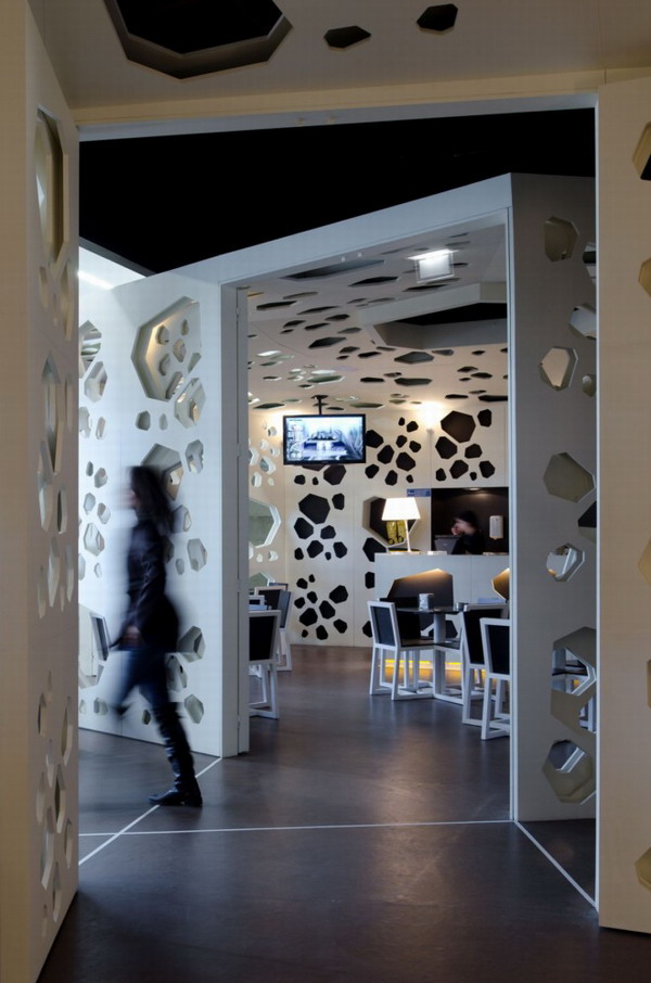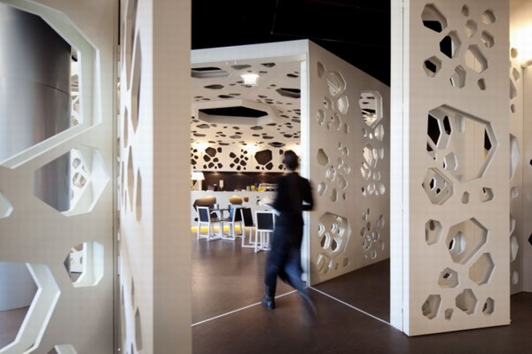 葡萄牙設(shè)計(jì)工作室LOFF完成了Meltino咖啡館的設(shè)計(jì)。整體幾何形的構(gòu)造,顯得有序而幽靜,全白色色系干凈而間接,咖啡館的設(shè)計(jì)理念就是將咖啡豆幾何化,孔狀結(jié)構(gòu)滲透墻面,形成不同的空間,它的影子印在地上,舞動著。