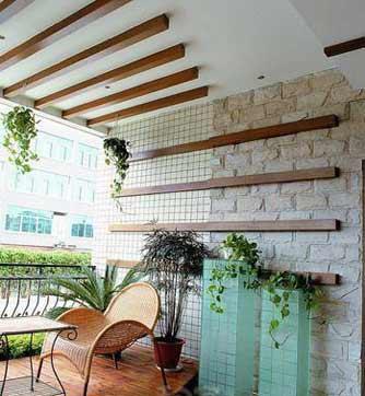 文化石與石材地板、瓷磚與實(shí)木地板,不同材質(zhì)的裝飾材料分別從地面和墻面將陽(yáng)臺(tái)劃分成兩個(gè)區(qū)域,獨(dú)立且又相互融合,與藤椅和綠色植物一起打造清雅的休閑花園。