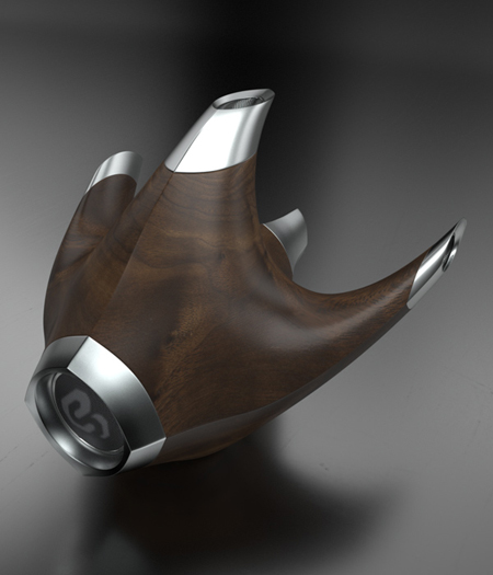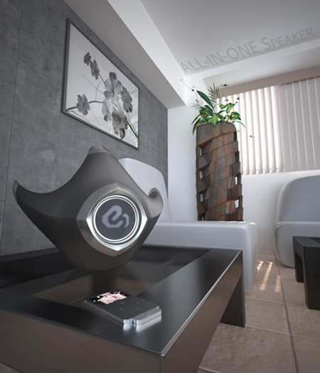 這款產(chǎn)品就好像一個(gè)未來(lái)的宇宙飛船一樣,在它的中心是一個(gè)低音炮,兩邊是兩個(gè)喇叭,而正上方是一個(gè)揚(yáng)聲器,它可以接收從iPod或iPhone通過(guò)藍(lán)牙所發(fā)出的數(shù)據(jù)。全部的表面都是使用木材或者光澤度很強(qiáng)的鋼制成的。