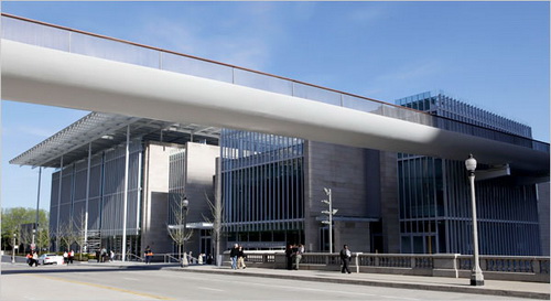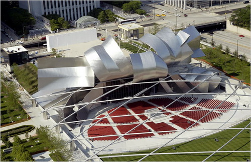 然而,“千年公園”的不尋常的影響力,來自對(duì)立的建筑構(gòu)思之間的“共生關(guān)系”。這種對(duì)立的建筑構(gòu)思,就是弗蘭克·蓋里(Frank Gehry)的粗獷的鋼結(jié)構(gòu)建筑“普利茲克露天音樂廳”(Pritzker Pavilion)和倫佐·皮亞諾(Renzo Piano)的玻璃-鋼材建筑物“芝加哥藝術(shù)學(xué)院”(Art Institute of Chicago)。這兩幢建筑物相對(duì)而立,一個(gè)狂放不羈;一個(gè)文靜典雅。并且,它們與“千年公園”一起,成為19世紀(jì)后期和20世紀(jì)早期的辦公樓和八十年代的高樓的配合失當(dāng)?shù)某鞘薪ㄖ髌贰?br />