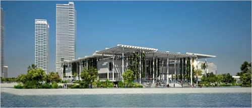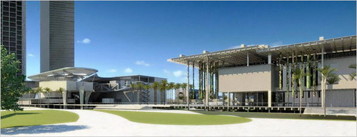 在邁阿密的一個(gè)文化區(qū)——這個(gè)惟一的仍然處于規(guī)劃階段的文化區(qū),由于在多年前就安排了資金,看來要繼續(xù)建設(shè)。它將采用類似的折衷方案。這個(gè)項(xiàng)目將利用靠近比斯坎灣的一個(gè)30英畝的垃圾填埋場(chǎng)建設(shè)。旁邊曾經(jīng)是邁阿密主要商業(yè)街道。一片呈波浪形的沙丘,阻斷了指向商業(yè)大街的視線,并且使這個(gè)地區(qū)在上個(gè)世紀(jì)七十年代和八十年代成為犯罪熱點(diǎn)。這片沙丘將被移走。新的科學(xué)和藝術(shù)博物館將建造在公園的旁邊。