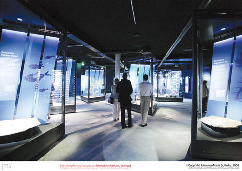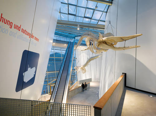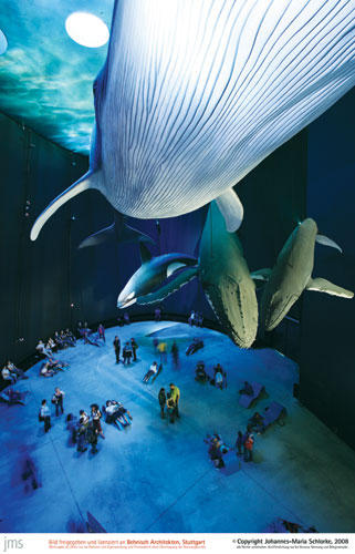 在弧形外殼的里面,有巨大的養(yǎng)魚缸、由“綠色和平組織”提供的實(shí)際尺寸的鯨的模型及關(guān)于波羅的海和北海的展覽,使參觀者沉浸在海洋生活中,同時(shí)提醒他們,關(guān)心本地環(huán)境和氣候變化的威脅。