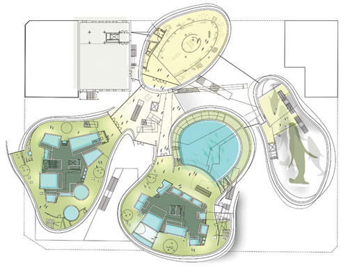 與實(shí)驗(yàn)室或辦公樓比較,博物館的功能要求與光線有關(guān),但水族館有它們自己的設(shè)計(jì)要求。在養(yǎng)魚缸里的大量的水,必須被處理過(guò)。要求有大規(guī)模的壓縮機(jī)、冷卻器、水泵和過(guò)濾系統(tǒng),這些設(shè)備都隱藏養(yǎng)魚缺的后面。