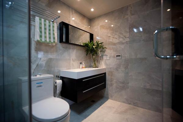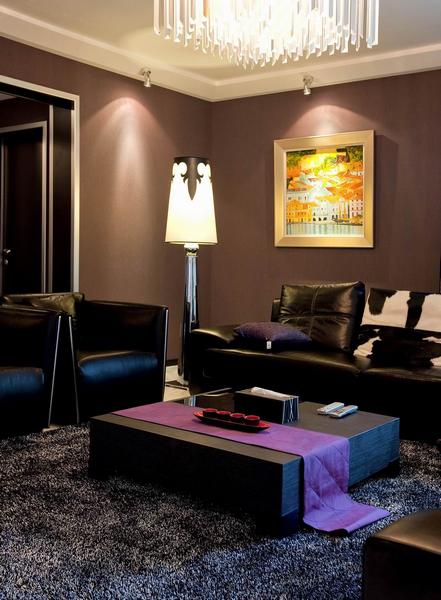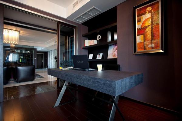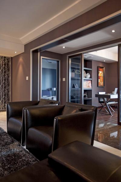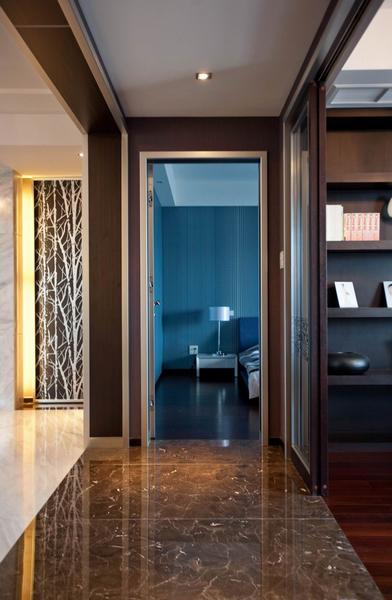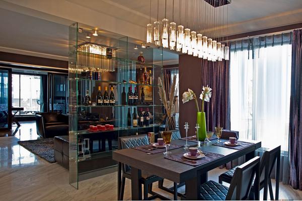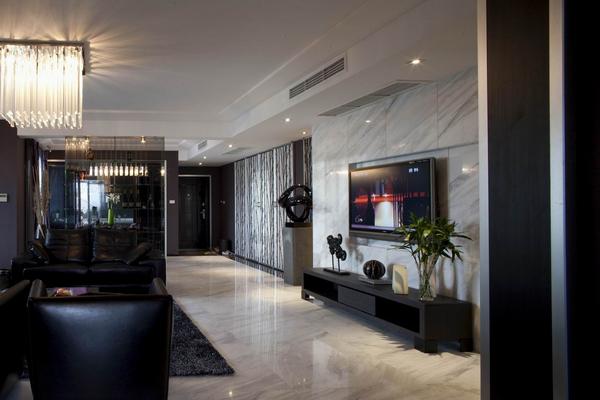 設(shè)計師試圖營造一種低調(diào)奢華的現(xiàn)代簡約氛圍,一種既厚重華麗又具時尚特色的視覺效果。整個空間用硬朗的金屬和玻璃與柔性的墻紙搭配,及黑白兩色的大理石地面相互映襯,再加上家具和軟飾的和諧統(tǒng)一,使的整個空間時尚簡約但又不失奢華。