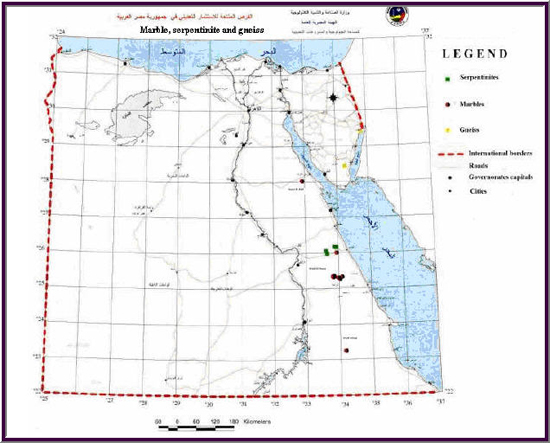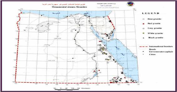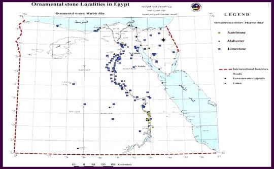 埃及境內(nèi)分布著豐富的建筑石材資源,主要分布在埃及東部和北部,主要產(chǎn)地有蘇伊士省的格魯?shù)律矫}、杰拉里山脈,西奈半島的阿利什地區(qū)、安彌利亞省的山區(qū)和開羅附近的喀特米亞山區(qū)。這些地區(qū)的石材產(chǎn)量占埃及全國供應(yīng)量的85%以上。下圖是埃及石材開采的主要省份。