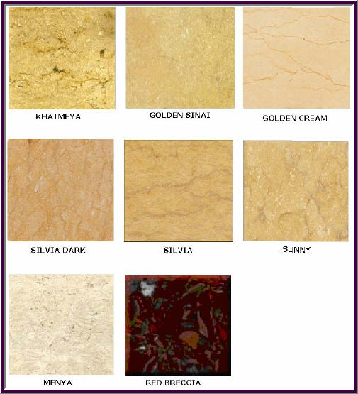 埃及大理石、花崗巖的花色品種依產(chǎn)地不同而有所不同,目前至少有25個類型。西奈半島出產(chǎn)的大理石以淺棕色為主,安彌利亞山區(qū)的大理石以金黃色為主,喀特米亞山區(qū)出產(chǎn)的大理石多為淺黃色,而蘇伊士省的大理石以奶黃色居多。其中,蘇伊士省出產(chǎn)的奶黃色大理石質(zhì)量最好,在中國最為暢銷,俗稱“埃及黃”。埃及本土也有紅色、黑棕色大理石出產(chǎn),但色澤、成材率都遠遠不如印度和歐洲的紅色和黑棕色大理石。有關(guān)產(chǎn)品的名稱、色澤特點參考圖五至圖八,有關(guān)產(chǎn)品的物理特性參考圖九。