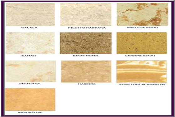 ?。?、仿大理石:埃及有豐富的石灰石和雪花石,這些石材易于打磨,通常也作為大理石來開發(fā)。埃及石灰石主要分布在Menya、Assiut、Zafarana、Khasm El-Raquba、Galala以及西奈半島北部地區(qū),其顏色取決于含鐵、碳等元素的多少。雪花石主要分布在Beni Seuf省東部的Wadi Sannur地區(qū),其獨特的白黃相間的顏色具有特殊的審美效果,適合小塊開發(fā),用于制作手工飾品。分布情況參考圖三。