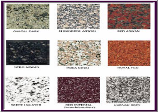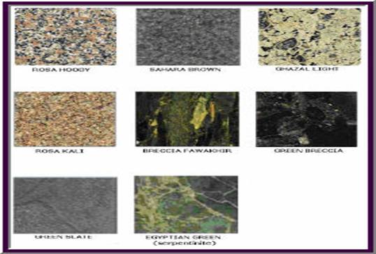 1、大理石:主要分布在阿斯旺東南270公里Wadi Al-Qlaqi 地區(qū)、東部沙漠Wadi Al-Miyah地區(qū)和紅海沿岸,具體情況參考圖二。所產(chǎn)大理石顏色深淺不一,花紋成糖狀結(jié)構(gòu),暢銷國內(nèi)外市場。