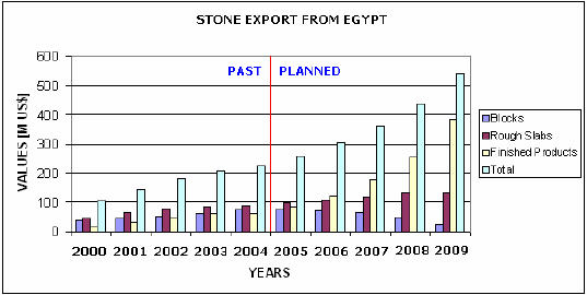 作為資源性產(chǎn)品的石材是埃及的出口支柱產(chǎn)品,政府非常重視,制定了以降低原料出口、擴大加工產(chǎn)品出口為核心的發(fā)展規(guī)劃,努力提高產(chǎn)品附加值。按照目前的市場價格,原料板材出口90萬噸可賺匯8500萬美元,平均每噸約94.4美元,而成品和半成品出口60萬噸就可賺匯1.443億美元,厚度為2厘米的板材平均每平方米13美元。因此,埃及政府把石材深加工作為該行業(yè)發(fā)展的主要目標,努力擴大出口規(guī)模。根據(jù)埃及大理石、花崗巖技術(shù)中心的報告,埃及石材出口每年增幅保持在26.9%, 到2009年總金額將達到5.38億美元,其中成品出口將占到71.2%。為了實現(xiàn)上述目標,埃及行業(yè)顯然需要不斷加大投資力度,提升技術(shù)水平,改進產(chǎn)品質(zhì)量,提高生產(chǎn)水平。圖十三是埃及出口發(fā)展的規(guī)劃表。