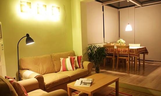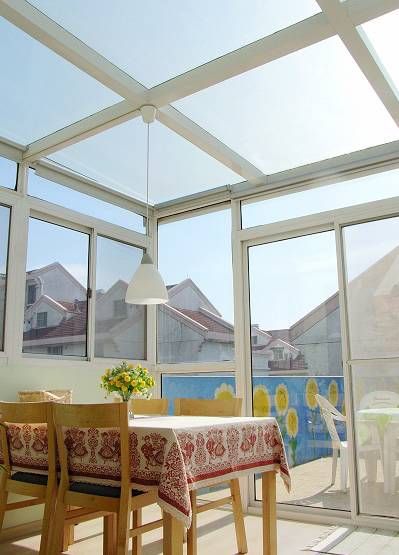 一張客廳全景,淡綠色的墻,很少的家具。餐廳實(shí)際是個(gè)陽光房,四周和頂部全是透明的玻璃。淡色的地板,多的是干凈。此時(shí)此刻,不管外面如何風(fēng)雨大作,里面永遠(yuǎn)是安逸和溫暖的。
