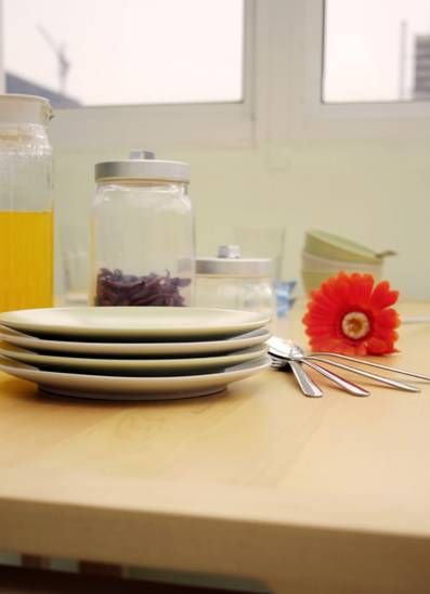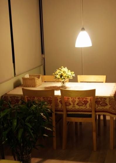 四人的餐桌。黃白色的雛菊,安靜的插在透明玻璃瓶里。一盞黃色的燈泡,外面乳白色的燈罩,吊在一根干脆的電線上。都不寂寞。