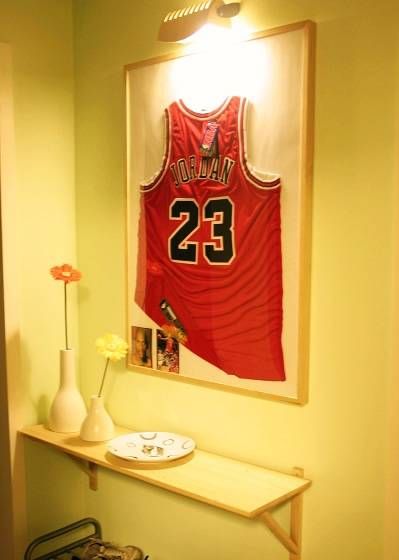 玄關(guān),大門打開第一眼看到的東西,只是簡簡單單三樣。一個(gè)裸露的鞋架,讓鞋子也能一起呼吸。一塊平常的擱板,擱板上放了一個(gè)盤,進(jìn)門的時(shí)候,隨手能放點(diǎn)小零小碎的東西。墻上是從美國帶回的正版喬丹球衣,自己最最寶貝的東西。